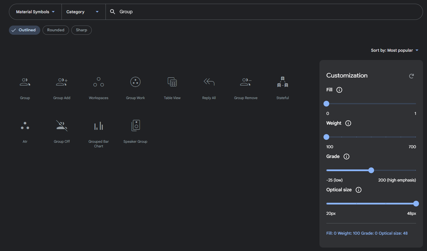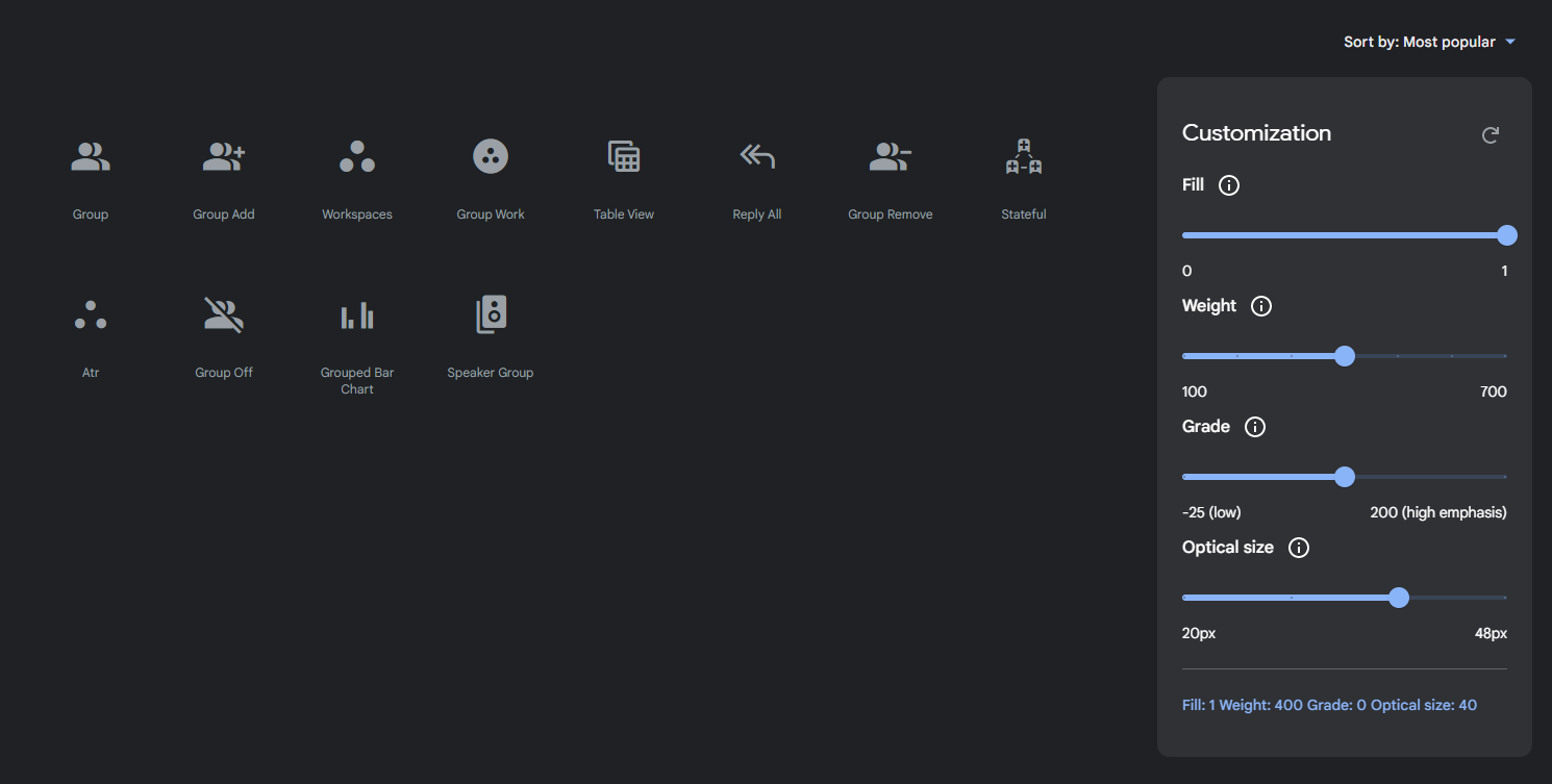 저는 Group 아이콘을 Fill - 1, weight - 400, Optical size : 40px로 설정하여 다운로드하겠습니다.