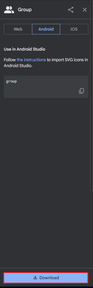 Download를 클릭하면 xml파일이 다운로드 됩니다. xml파일은 Vector이미지를 안드로이드에 맞게 xml로 변환한것으로 바로 사용이 가능합니다.